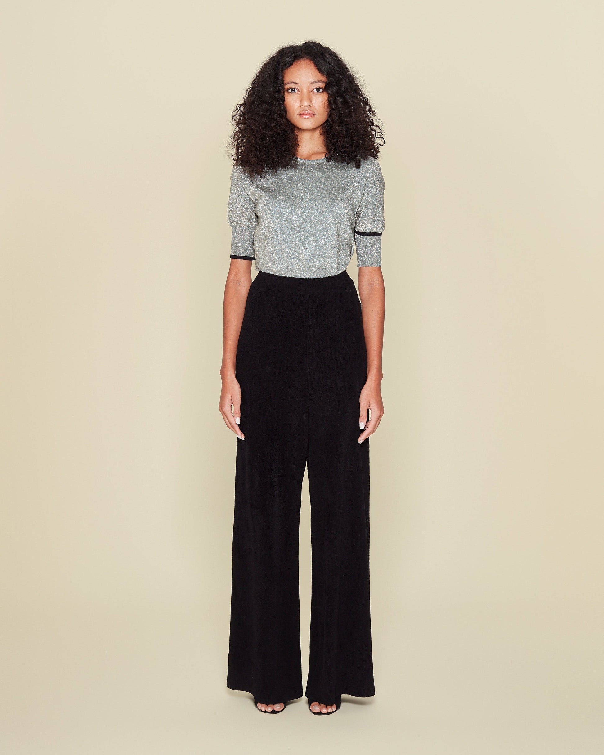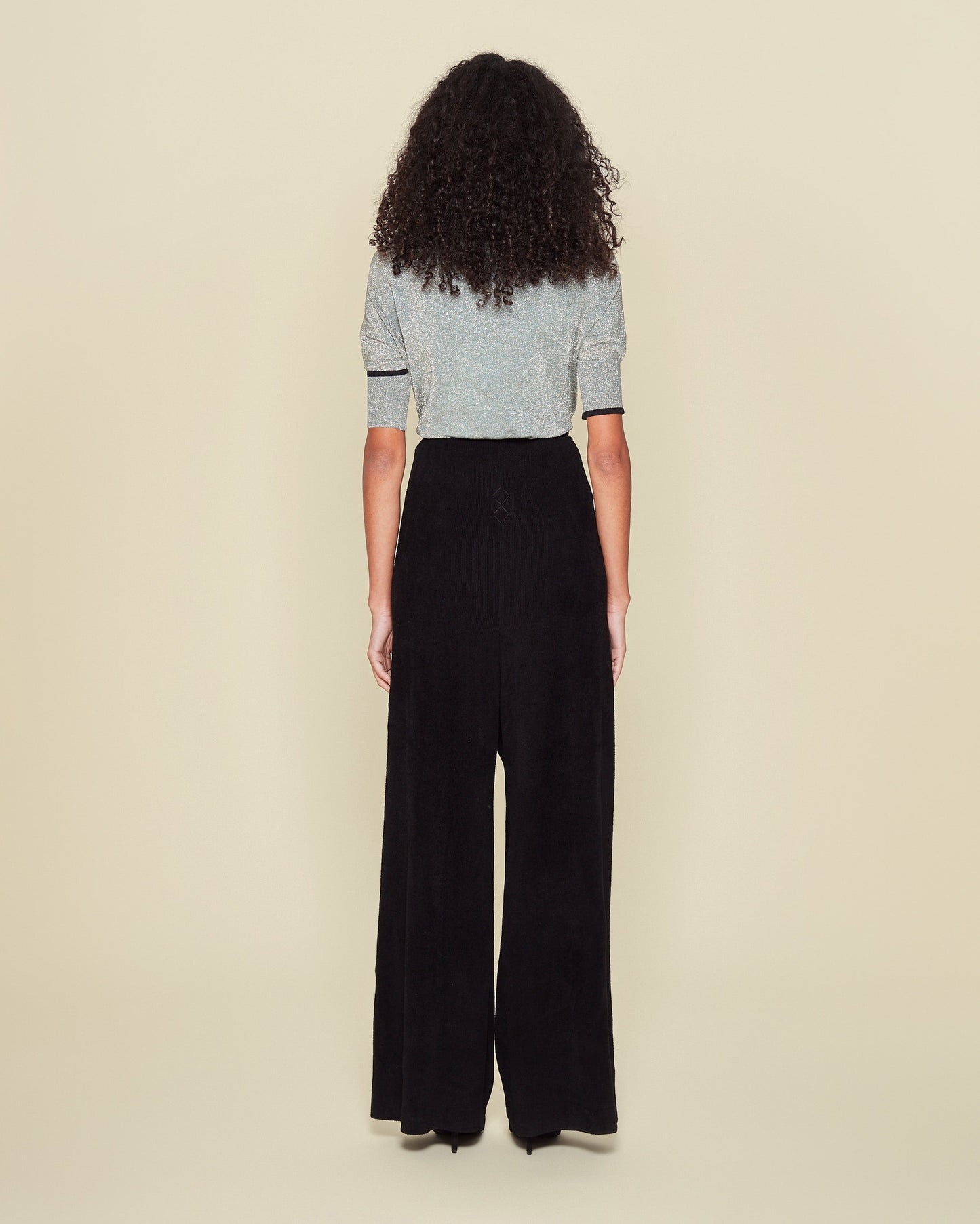 All finishes touches are completed by hand. Characterized by a very essential waistline and an extra length of the trousers with an original palazzo detail