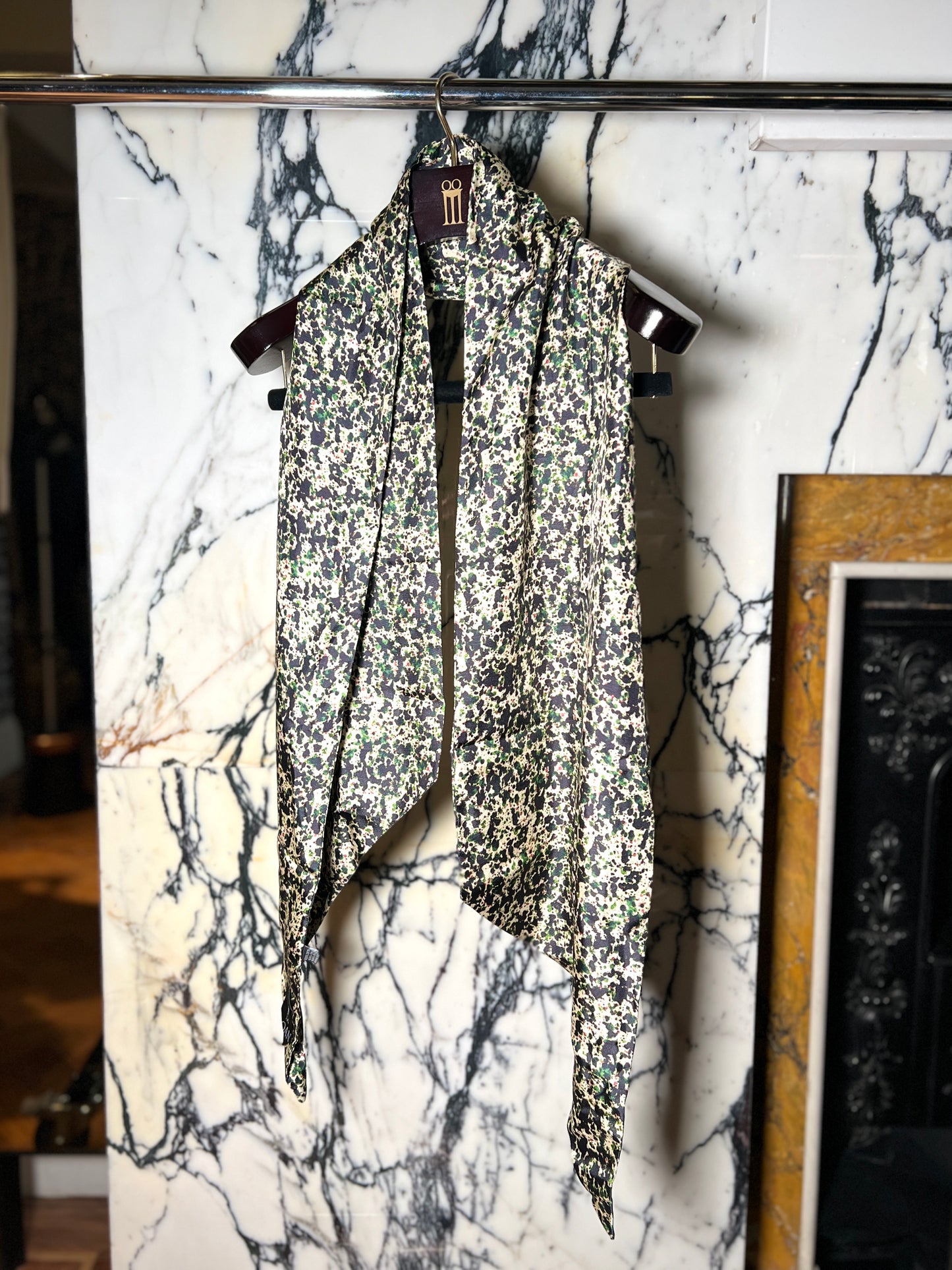 This speckled tubular scarf is the perfect accessory for eveningwear. Made of soft and luxurious fabric, it can be worn wrapped around the neck multiple times, or draped elegantly over the shoulders. Its simple design and interesting color scheme make it a versatile piece that can be paired with a variety of outfits.