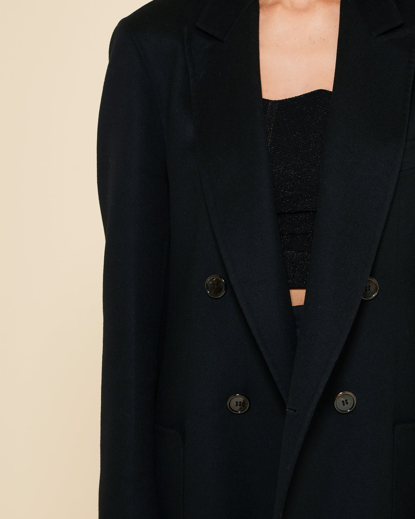 This stylish double-breasted blazer features hidden sawings for a sleek and polished look. It is designed with shoulder pads and sleeve lining for added structure and comfort. The front showcases patch pockets and binded pockets for a touch of sophistication. The blazer fastens with a single button and has buttoned cuffs for a refined finish.