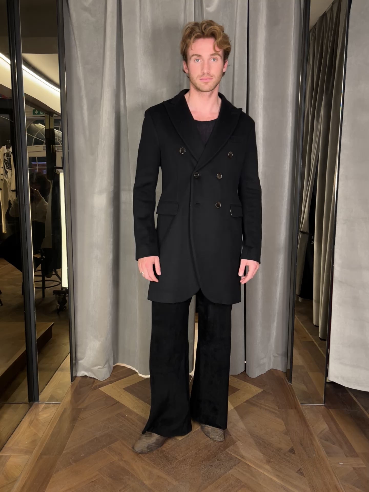 The Michael Overcoat is made in Italy using a combination of melton wool and cashmere. It is assembled by a specialized tailoring house in Tuscany and finished to the highest standards. The jacket features a peaked lapel and is half lined with a screen-printed viscose twill signature lining. The label is stitched in by hand using a Japanese quilting technique for authenticity. The Michael Jacket combines Italy's craftsmanship tradition in knitting and weaving for ultimate comfort.